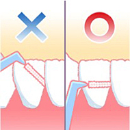 歯と歯の間の一番きつい所を通過したら、後は歯と歯肉の間にも少し入れて上下に汚れを掻き出すように動かします。
